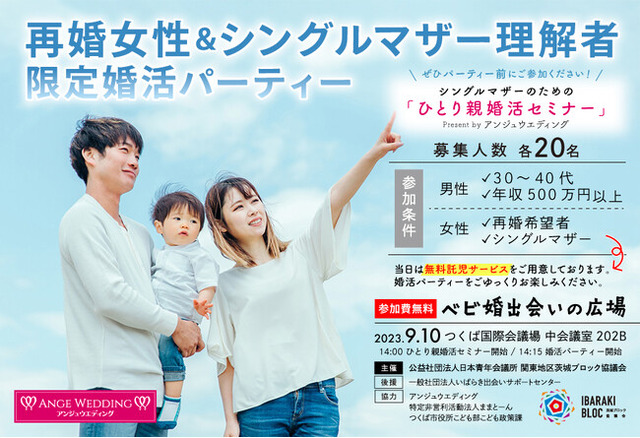 ベビーファーストを推進するためには、男女が出逢い結婚をしなければいけない。そのための一つの手法として、再婚女性&シングルマザー理解者限定の婚活パーティーを企画致しました。開催に際して、ひとり親向け再婚セミナーをアンジュウエディング代表 来田喜巳氏を講師に迎えて行います。