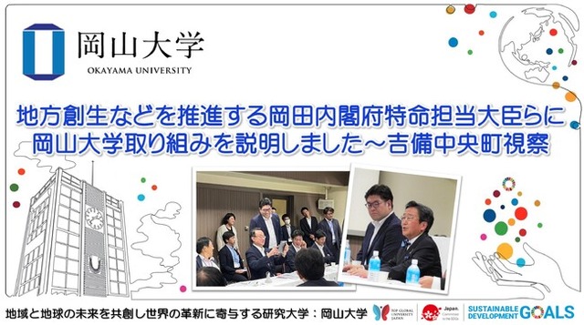 国立大学法人岡山大学は、国連の「持続可能な開発目標(SDGs)」を支援しています。また、政府の第1回「ジャパンSDGsアワード」特別賞を受賞しています。地域中核・特色ある研究大学:岡山大学にご期待ください