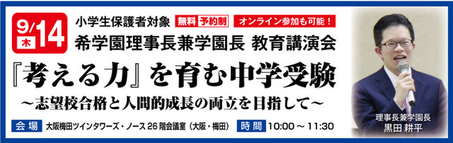 株式会社 希(のぞみ)学園(本社:兵庫県 西宮市/理事長 兼 学園長 黒田耕平/以下「希学園」)は、特別企画といたしまして、小学生の保護者の方を対象に、理事長 兼 学園長 黒田耕平 教育講演会を実施いたします。