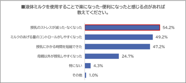 半数以上のご家庭が液体ミルクを利用している結果となり、その中でも液体ミルクの利用によって「授乳のストレスが減った・なくなった」と回答する人は54.2%に達しました。
