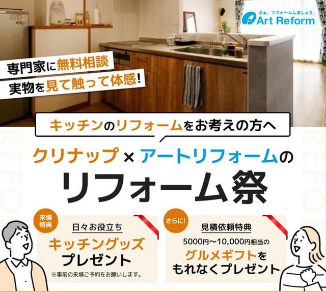 全国でリフォーム・リノベーション工事を年間6,500件以上手がける株式会社アートリフォーム(本社:大阪府吹田市、代表者:代表取締役社長 大本哲也、以下「アートリフォーム」)は、2023年9月2日(土)~3日(日)に千里万博支店、高槻支店、豊中支店の3支店合同で『クリナップ×アートリフォームのリフォーム祭』を開催する。会場はクリナップ北大阪ショールーム。