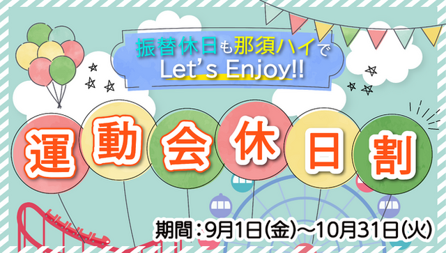 藤和那須リゾート株式会社(栃木県那須町/代表取締役社長:岩本 大二郎)が運営する“那須ハイランドパーク”では、9月1日(金)~10月31日(火)の期間中、運動会の振替休日でも最高の思い出をつくっていただきたいという思いから、入園+アトラクション乗り放題パスをお得にお買い求めいただける「運動会休日割」を実施いたします。