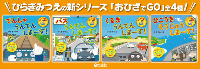 赤ちゃんを抱っこして、いっしょに運転しながら遊べる絵本「おひさでGO」シリーズ全4巻、出揃いました。著者は、ひらぎみつえさん。でんしゃ、くるま、バス、ひこうき。おひざの上で出発進行! 赤ちゃんも大人も、大はしゃぎ。笑顔の時間をお届けします。
