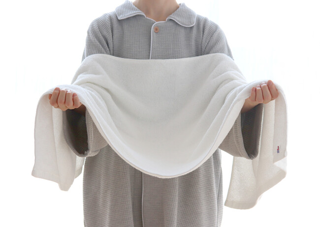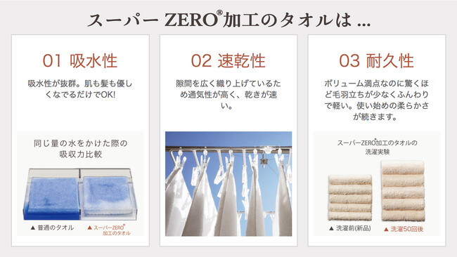 スーパーZERO(R)とは、この加工を施すと糸に空気を多く含み、同じ重さでもボリューム感のあるタオルになり、洗濯をしてくり返し使いこむほどに、ふっくらとやわらかな風合いとなります。また、吸水性に優れているので、体や髪への摩擦も少なく、摩擦によるダメージを軽減する事ができる髪にも肌にも優しいアイテムです。
