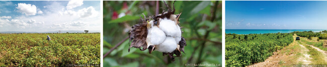 商品に使用している海島綿は、西インド諸島の限られた地域に生育する超長綿です。普通の綿の繊維長が20~25mmであるのに対し、超長綿は繊維長35mm以上の物を指します。その超長綿の中でも、トップレベルの繊維長をもつのが海島綿です。繊維長が長いと糸を紡ぐ際に撚り回数が少なくて済むので、柔らかくしなやかな糸ができ、なめらかな肌触りとシルクのような光沢が生まれます。