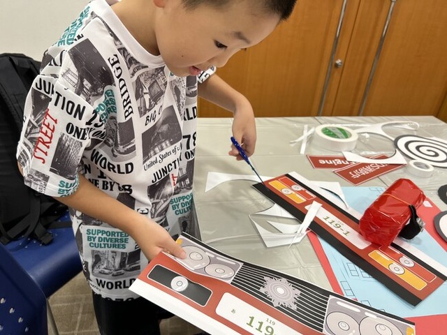 段ボールキットで消防車を作り、それを使った疑似消⽕体験と記念撮影、館内パトロールを行います。段ボール消防車はお持ち帰りいただき、お片づけ箱としてご利用いただけます。