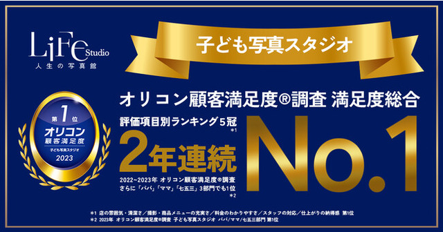 人生の写真館『ライフスタジオ』( https://lifestudio.jp/ )は株式会社oricon ME発表した「子ども写真スタジオ」ランキングで、2年連続総合1位に選出されました。部門別でも高い評価となった他、推奨意向97.0%※1再利用意向95.7%※2となり、多くのユーザーから高い評価をいただきましたのでご報告いたします。