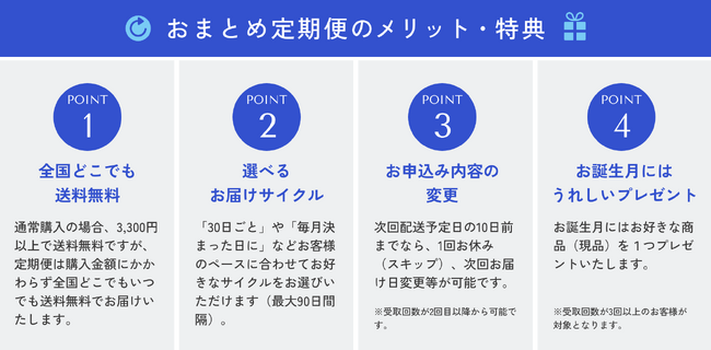 通常購入の場合、3,300円以上で送料無料ですが、定期便は購入金額にかかわらず、全国どこでも送料無料でお届けいたします。