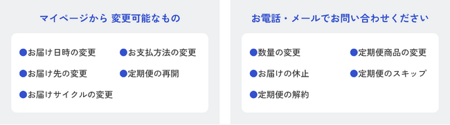 商品が余っている場合は、おまとめ定期便を2回継続後に、次回お届けを1回お休み(スキップ)や休止が可能となります。お届け日や時間、お届け先などについては、継続回数に関わらず変更可能です。定期便に関するご変更は次回お届け予定日の10日前までにマイページまたはお電話にてお手続きください。