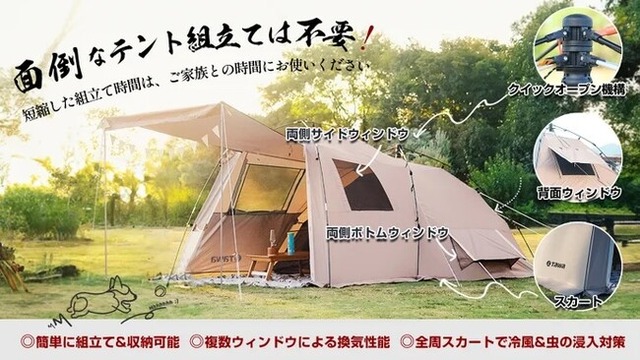 大きなテントの設置は面倒だと感じている方に朗報!クイックオープン機構で超簡単組立て&収納できるテントが完成!エントランス、リビング、ベッドルームの3セクション構成でゆとりある空間に家族と過ごせます!耐水性生地使用、複数窓で通気性抜群、全周スカートで冷風対策、メッシュ素材のインナーテントで快適です。