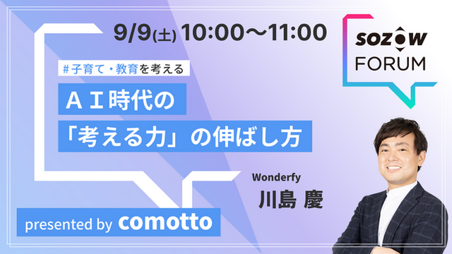 「好奇心と可能性を解き放ち、未来をSOZOWする学びの生態系をつくる」をビジョンに掲げるSOZOW株式会社(所在地:東京都品川区、代表取締役:小助川 将)が開催する大人の学び合いセミナー「SOZOW FORUM 2023秋 "令和の子育て"を考えよう」において、9月9日(土)にcomotto(株式会社NTTドコモ提供)によるAI時代の教育やマネー教育を考えるセッションの追加開催が決定いたしました。