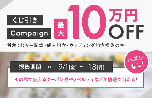 9月1日(金)~9月18日(月)の間に、七五三記念、成人記念、ウェディング記念写真を撮影された方は、撮影後にくじ引きキャンペーンにご参加いただけます。