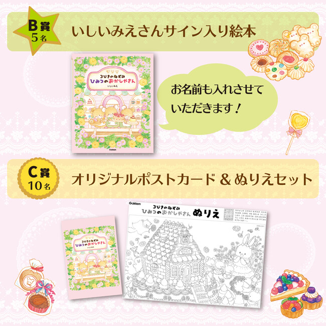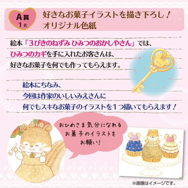 絵本にちなみ、A賞は作家のいしいみえさんに何でも好きなお菓子のイラストを1つ描いていただけます!