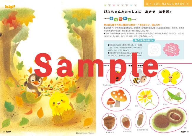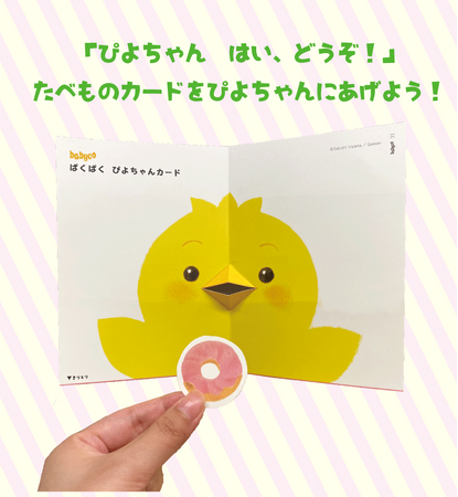 babycoでいま、大注目の『0さい・1さい2さい はじめてのワーク』に、ぴよちゃんと一緒にあそぶワークが登場! 季節感のある「あきのあそび」と、ぴよちゃんにたべものを食べさせる「ぱくぱく ぴよちゃん」の2種類のカードあそびワークです。かわいいぴよちゃんと一緒に、赤ちゃんとのあそび時間を楽しんでください。
