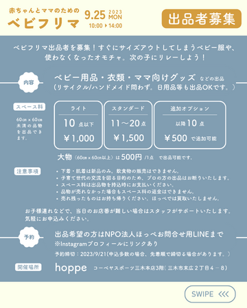 特定非営利活動法人ほっぺ(代表:大森 奈津子)によるベビー用品、衣類、ママ向けグッズを中心としたフリーマーケットを、9月25日(月)にhoppe(コーベヤスポーツ三木店3階)にて、「赤ちゃんとママのための~ベビフリマ~」を開催いたします。