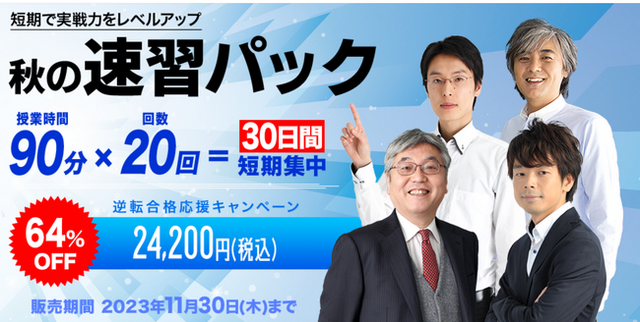 「秋の速習パック」は、この時期に受験対策のメインとなる問題演習を中心とする講座を、科目別にパッケージ。受講期限30日で効率的に「速習」する講座構成となっています。受験生応援キャンペーンのため価格も64%OFFと大幅にプライスダウンし、取り組みやすい特別価格でご提供いたします。