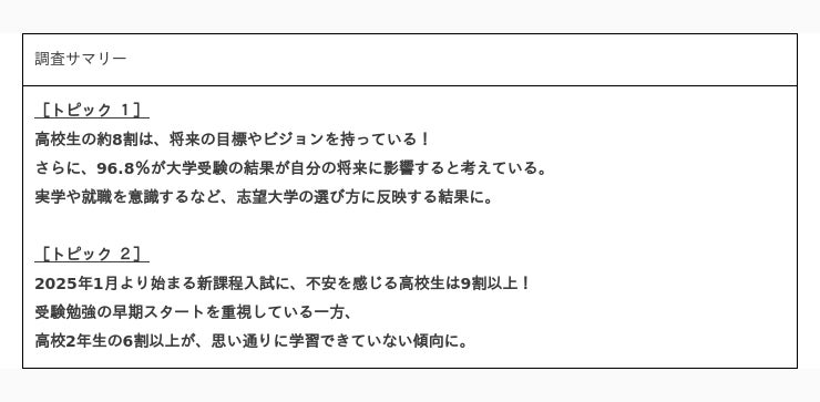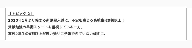 少子化に伴い、大学志願者が大学の入学定員を下回る、大学全入時代が到来しています。その一方で、高校生の多くは大学受験が自分の将来に影響すると考えているため、大学選びに慎重になっている傾向が表れました。さらに「新課程入試」への不安などから、受験勉強の早期スタートを重視するといった、高校生の受験意識が明らかになりました。