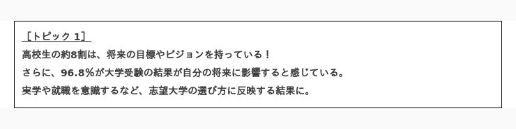 また、「大学受験の結果が自分の将来に影響すると思っている」高校生は96.8%でした。大学全入学時代といわれる一方で、当事者である高校生は、慎重な大学選びを行っていることがわかります。