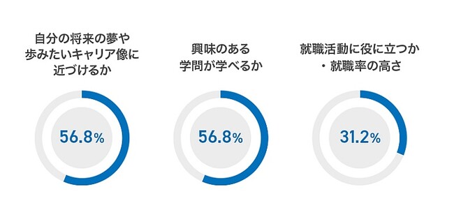 また志望大学を決めた基準トップ3は、「自分の将来の夢や歩みたいキャリア像に近づけるか」、「興味のある学問が学べるか」、「就職活動に役に立つか・就職率の高さ」という結果でした。卒業後の将来を見据え、実学志向を持つ高校生が多いことが見受けられます。