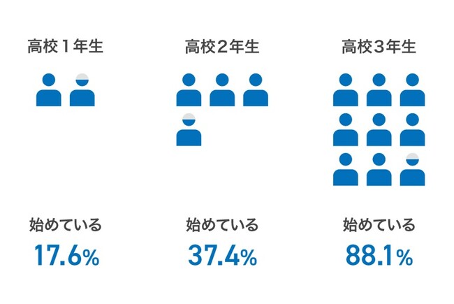 その一方で、高校1年生の約8割、高校2年生の約6割が受験勉強に着手できていない現状も明らかになりました。受験勉強を早期に始めたいという意識はありながらも、実際は行動に移せていない生徒が大部分を占めています。