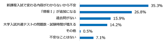 高校1年生と2年生に対して、2025年度からの新課程入試について質問したところ、9割以上が何らかの不安を感じていることがわかりました。特に35.3%は「新課程入試で変わる内容がわからないから」と答え、漠然とした不安を抱えている高校生が最も多い結果となりました。また、大学入学共通テストへの「情報I」の追加や過去問がないことなど、誰も経験していない入試に対し、対策の不明瞭さに不安を感じていることがうかがえます。