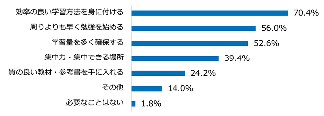 新課程入試への不安の中で、95.3%が「新課程の入試対策は早めに始めた方がいい」と回答しました。また、高校生活と受験勉強を両立し現役合格するには、「効率の良い学習方法を身に付ける」ほか、「周りよりも早く勉強を始める」、「学習量を多く確保する」ことを重視している生徒が半数以上いることが明らかになりました。将来のビジョンを実現するため、効率的な対策のサポートと受験勉強の早期スタートが必要と感じていることがわかります。
