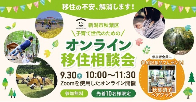 新潟市秋葉区は豊かな自然と、首都圏からのアクセスの良さ(約2時間30分)から、子育て環境に適したエリアとして移住支援に取り組んでおり、移住について心配な点を解消していただく場として、「子育て世代のためのオンライン移住相談会」を開催しています。