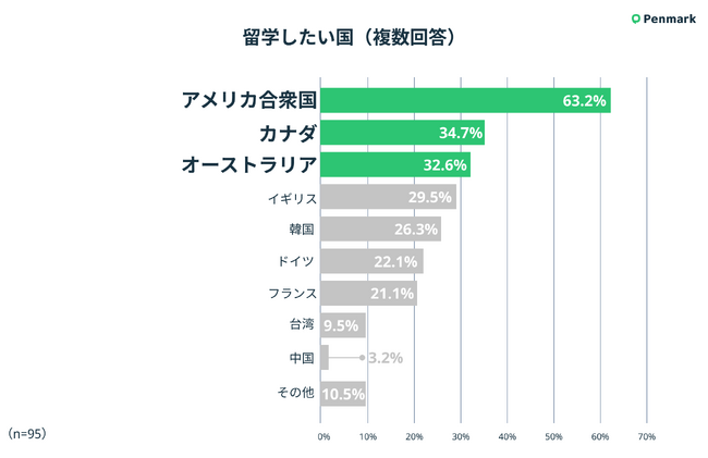 留学したい国は、アメリカ合衆国(63.2%)が最多
