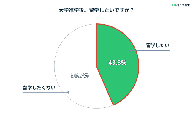 高校生の留学意欲は、「留学したい(43.3%)」「留学したくない(56.7%)」という結果となった。
