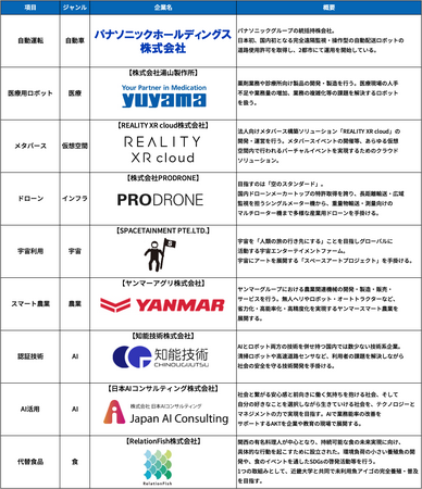 自動運転、医療用ロボット、メタバース、ドローン、宇宙利用、スマート農業、認証技術、AI活用、代替食品