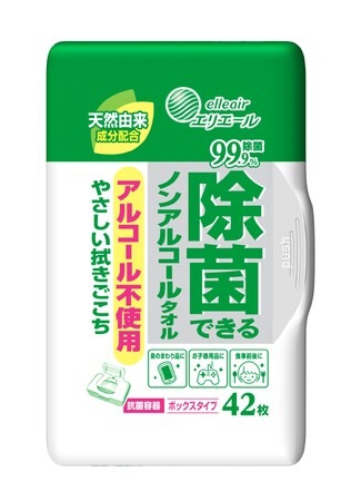 『エリエール 除菌できるノンアルコールタオル』は、天然由来成分(グレープフルーツ種子抽出エキス、アロエエキス)配合のノンアルコールタイプの除菌シートです。アルコールが使えないお子さまとの生活や、除菌はしたいけれどアルコールは苦手という方にもお使いいただくことができ、身の回りの除菌以外にもおもちゃの除菌やお食事前後の汚れの拭き取りなどにおすすめです。シートは、布目が粗く汚れのかきとり性が高い「杉綾不織布」を使用しており、拭くだけで簡単に除菌が可能です。また、本商品は弱酸性・無香料・パラベンフリーに加え、当社独自の手肌スッキリ処方によって、拭いた後のべたつきを抑え使い心地も快適です。今回のノンアルコールタイプの追加により、「除菌できるシリーズ」は除菌アルコール・ウイルス除去用・抗菌成分プラスの4つのラインナップに拡充いたしました。今後も生活者のニーズやライフスタイルにあわせて安心・安全な除菌習慣をご提供してまいります。