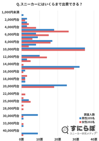 男女407名のアンケートを通じて、スニーカーに出費できる一般的な金額が明らかになりました。金額の平均は13,656円となりましたが、現在の市場価格を見ても納得の結果と言えるでしょう。また、20,000円を超える回答が少ないことから、一般的には多く出せても20,000円が上限になるのではないかと思います。