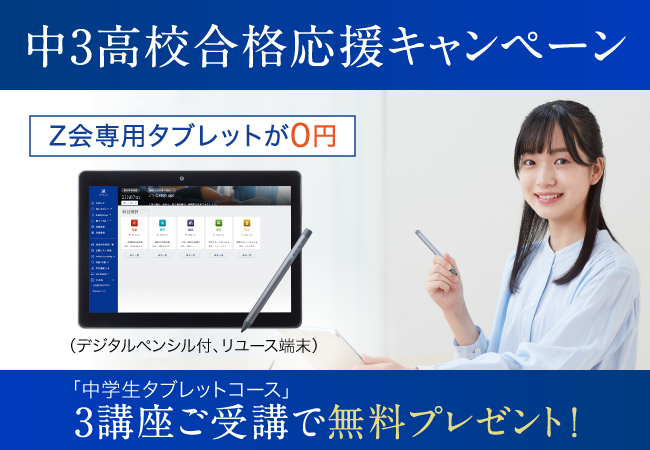 Z会では、高校入試に向け、受験勉強をがんばる中3生を応援する「中3高校合格応援キャンペーン」を期間限定で実施中です。Z会の中学生タブレットコースを3講座以上お申し込みの方に「Z会専用タブレット」を無料でプレゼントします。