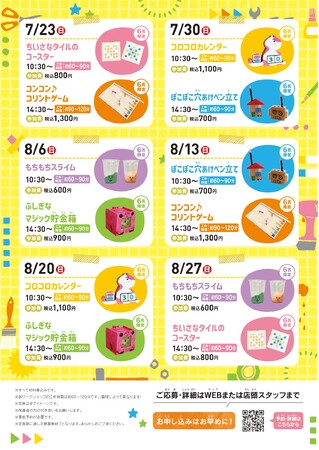 ※1 タイルコースター・コリントゲーム・カレンダー・ペン立て・もちもちスライム・貯金箱を作るワークショップ