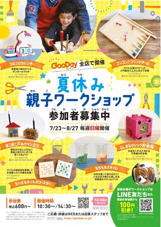 株式会社グッデイ(本社:福岡県福岡市 代表:柳瀬隆志 以下グッデイ)では、全62店舗(休店中大野城店及びYahoo!店除く)にて2023年夏休み親子ワークショップを開催しました。コロナ禍の影響で2020年・2021年は全てのワークショップを中止、昨年2022年から夏休み親子ワークショップの開催を復活し、2023年開催分はコロナ禍前の2018年開催に次ぐ参加者となりました。