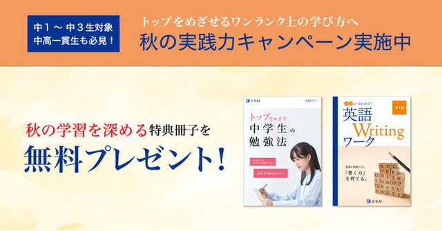 Z会では、「秋の実践力強化キャンペーン」として、着実に学習を進めて成績アップしていくための学習情報誌や、英語の書く力を育てる英作文ワークをプレゼントしています。