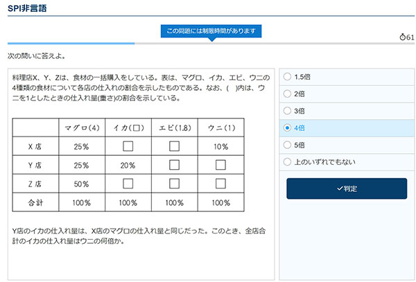 SPIのWebテスト形式(テストセンター・WEBテスティング)のジャンルに対応しています。 言語問題30問/非言語問題20問、合計50問の問題を解くことができます。