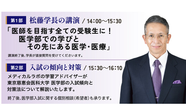 医系専門予備校として合格者数No.1(※「株式会社東京商工リサーチ」調べ/2023年度入試 医学部医学科合格者1,183名 2023年5月6日現在)、北海道~鹿児島まで全国27校を展開する医系専門予備校メディカルラボ(河合塾グループ)は、10月1日(日)東京慈恵会医科大学 松藤学長をお招きし、医学部合格を目指す受験生の皆様への講演を開催いたします。最難関かつ、受験生人気の高さから私立医学部四天王の1つとも言われる東京慈恵会医科大学。松藤学長自らにより、医学部の学習内容、大学生活、進路などとともに、医学研究や医療の現状についてお話が聴ける貴重な機会となります。東京慈恵会医科大学の医学部を志望されている受験生の皆さま・保護者の皆さまはぜひご参加ください。