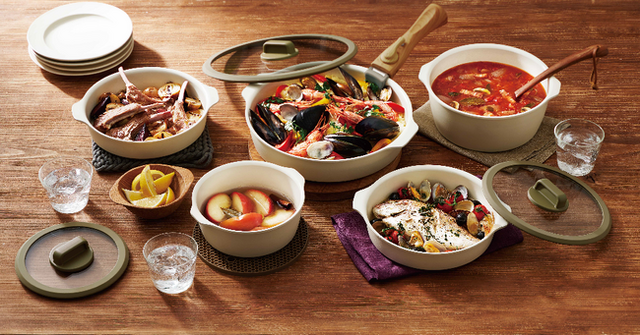 全3種類のセット(6点、8点、12点)には、ガラスふた、保存時に役立つPEシールふた、取り外して使えるマルチハンドルや鍋敷きが含まれており、全てを重ねて収納できるので狭小住宅などの限られた大きさのキッチンでも収納できます。また、内側にセラミックコーティング(※2)を施しており、調理中も焦げ付きにくく、手入れも容易です。