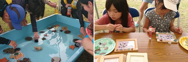 またシーグラスアート体験ブースでは、シーグラスや貝殻を思い思いに貼り付けてオリジナル写真立てを制作します。好みの色や形を選び「かわいい」「上手に作れた!」と工作を楽しみました。シーグラスが大村湾に浮かぶ無人島 鷹島(長崎県西彼杵郡時津町)で拾ったものだと教わると、「すぐそばの島だね」と一気に身近な存在となり、「捨てられたごみだったの?」とさらに興味が高まりました。