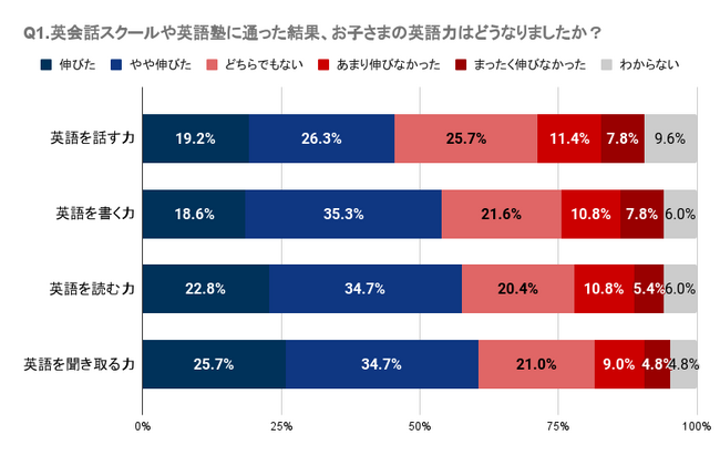 Q1で「英会話スクール、英語塾に通った結果、お子さまの英語力はどうなりましたか?」と質問したところ、和歌山県では英会話スクールや塾に通って英語のスキル向上を明確に感じられなかったと感じている人が一定数いることが分かりました。具体的には、英語を話す、書く、読む、聞き取る各スキルにおいて、「伸びた」と感じる人は約19%~26%であり、一方で「あまり伸びなかった」や「まったく伸びなかった」と回答した人が合わせて約14%~19%となっています。特に、「英語を話す力」と「英語を書く力」においては「あまり伸びなかった」と「まったく伸びなかった」の合計がそれぞれ19.2%、18.6%となっています。また、各スキルに関して「どちらでもない」と答えた人も含めると、約35%~45%となっており、明確な効果を実感していない人が一定数存在することが伺えます。