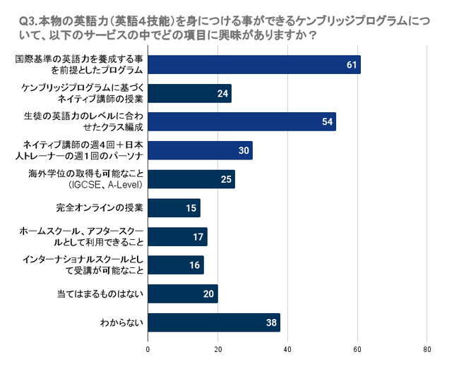 ■ケンブリッジプログラムにおける関心は国際基準の英語力養成と個別対応がトップ2