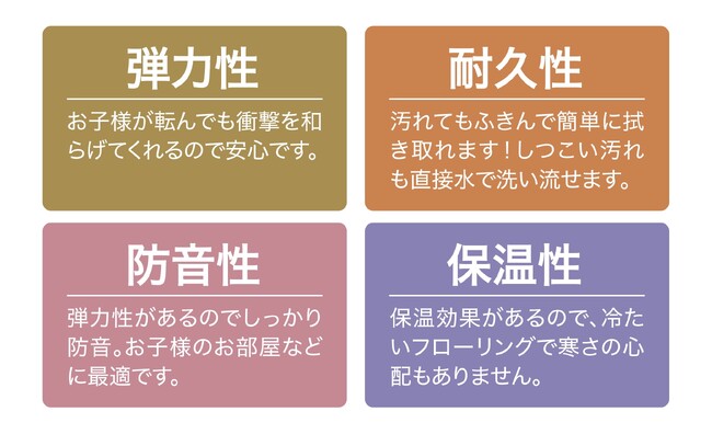 お子様が転んだときや家具の脚などから床を守る“弾力性”。汚れても簡単に拭き取れる“耐久性”。マンションなどで足音を軽減してくれる“防音性”。フローリングで感じる冷たい「ヒヤッと感」をやわらげてくれる“保温性”を兼ね備えています。
