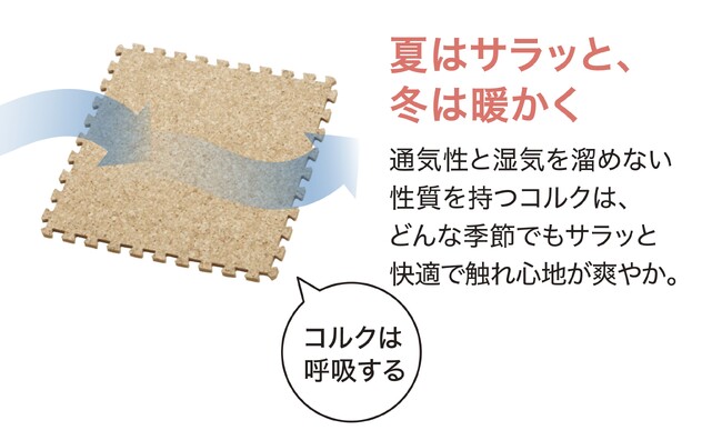 表面は天然コルクを使用しているので、夏はサラッと爽やかに、冬は保温効果もあるので暖かく快適な踏み心地が味わえます。