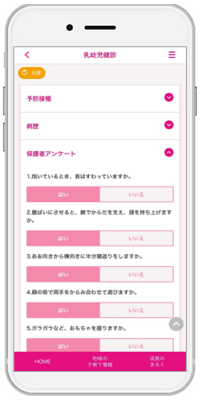今回、『母子モ』を通じて医療機関において実施する、4か月児健診、7か月児健診、1歳6か月児健診、3歳児健診(視聴覚検査を含む)の4回の乳幼児健診をすべてデジタル化し、保護者は問診の記入・提出、健診結果の確認がアプリから可能となります。