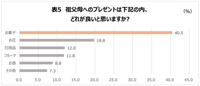 祖父母へのプレゼントの内容に関して、「お菓子」が40.5%と最も多く、多くの子どもたちが祖父母へのプレゼントにお菓子が良いと思っていることが分かりました。
