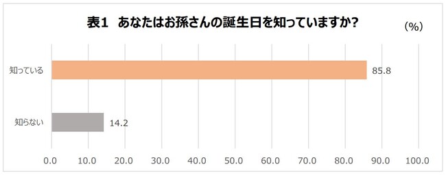孫がいる祖父母に、孫の誕生日を知っているかという質問に対して、85.8%が「知っている」と回答し、ほとんどの方が孫の誕生日を把握している結果となりました。