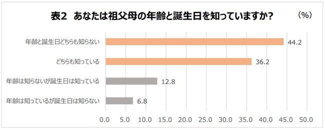一方で、6-12歳の子どもに、祖父母の年齢と誕生日を知っているかと聞くと、「年齢と誕生日どちらも知らない」が44.2%、「どちらも知っている」が36.2%。また「年齢は知らないが誕生日は知っている」が12.8%、「年齢は知っているが誕生日は知らない」が6.8%となり、子どもは祖父母の情報をあまり把握していない結果となりました。