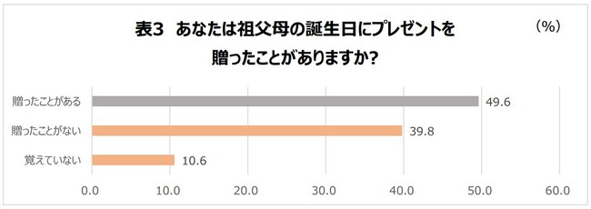 祖父母の誕生日にプレゼントを贈ったことがあるかという質問に対しては、49.6%が「贈ったことがある」、 39.8%が「贈ったことがない」、10.6%が「覚えていない」と回答し、約半数の子どもが、祖父母に誕生日にプレゼントを贈ったことがない、もしくは覚えていないことが分かりました。