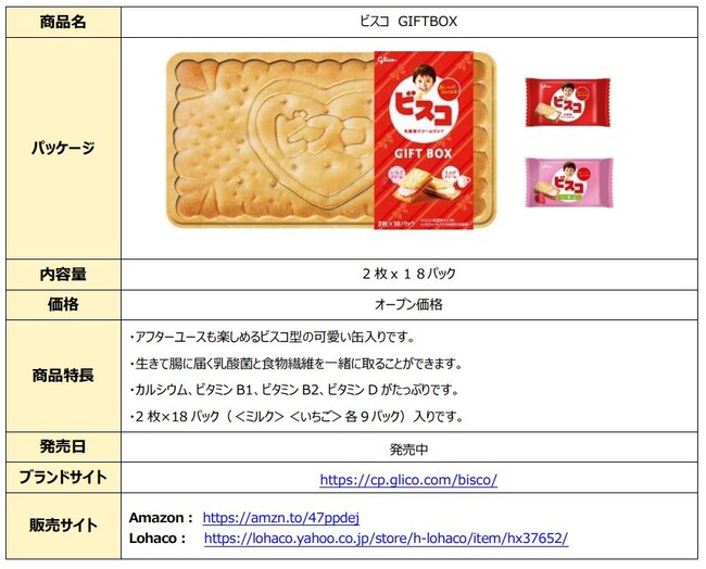 「ビスコ」は、生きて腸に届く乳酸菌、食物繊維、カルシウム、ビタミン B1・B2・Dを含む、おいしくて体にうれしい乳酸菌クリームサンドです。小さな子どもから大人まで食べ慣れたあっさりとした甘さで、90年間、子どもたちのすこやかな成長を応援し続けています。そして、「ビスコ」は小箱に加え、オールシーズンの手土産や食べた後の小物入れとしても人気な「ビスコGIFTBOX」など、家族みんなで楽しめる商品も展開をしています。